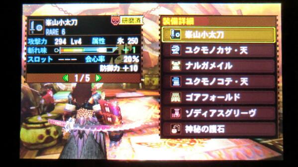 【モンハン4】2、3日前の話だが、久々に良武器掘り当てた。赤色(無発光)峯山小太刀。氷属性で火力充分。欲を言えば、スロット1だけでも欲しかったが、まぁーしょうがない。