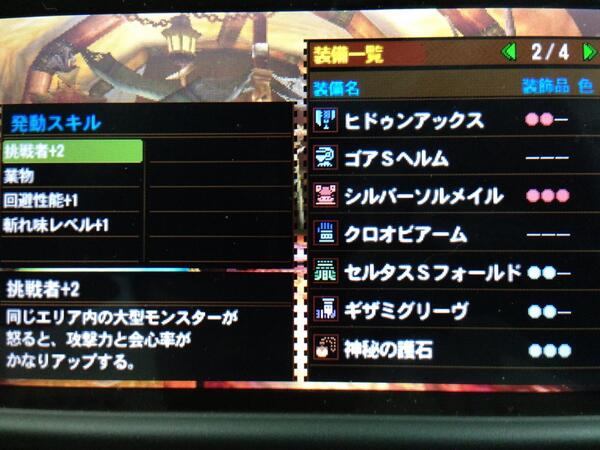 【剣士お勧め装備構成】 (護石 匠5S3)武器スロ2(スキル 挑戦者+2 回避性能+1 業物 斬れ味レベル+1)製作者曰く腰のセルタスが残念な装備だそうです。匠5S3があればこんなスキルが組めるんですね。 #MH4 pic.twitter.com/C9CNwfrmnQ