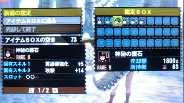 【モンハン4】seed2:41887。歪3枠目:攻撃。判定値:22。スナイプ初成功が、これのスロ1だったんだよなぁ・・・なんてことを思い出しつつ、最高性能で更新。